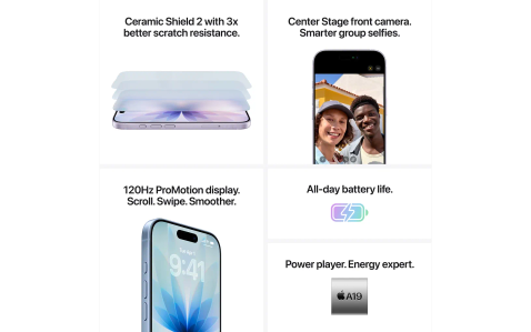 6,9 tuuman Super Retina XDR- näyttö, Applen A19 Pro -siru, ProMotion 120Hz näyttö
